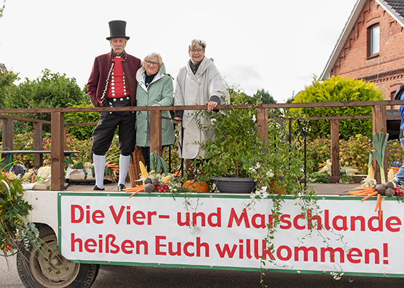Im Anschluss zog der große Erntedankumzug mit 72 festlich geschmückten Wagen durch die Deichstraßen. Tausende Besucherinnen und Besucher säumten die Strecke, während das Wetter beständig blieb. Auf dem Festplatz an der Schafswiese erwarteten die Gäste Musik, Tanz, Informationen zu nachhaltiger Landwirtschaft und kulinarische Angebote.